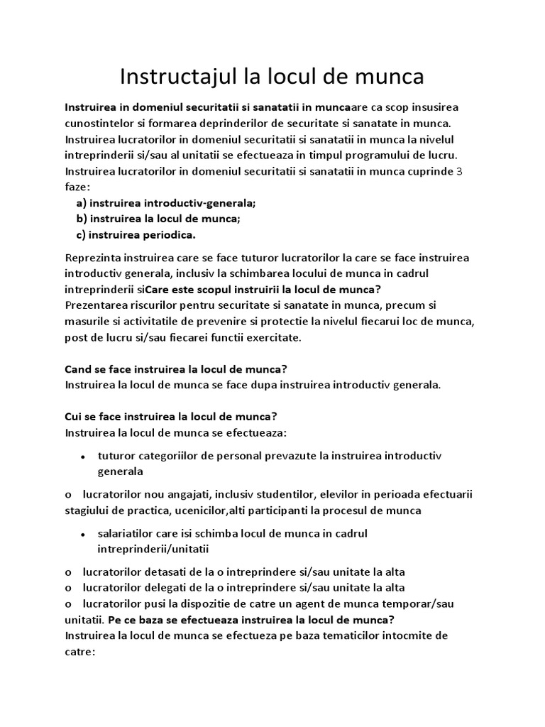 Free online dictionary in english, german, french, spanish. Ro în timpul instruirii la locul de muncă, organizația de pregătire se asigură că instructorul deține aceleași informații ca persoana care urmează un curs rāda lapa 1. De multe ori instruirea la locul de munca este considerata o formalitate, care trebuie redusa in cel mai bun caz la completarea si semnarea la timp a fiselor individuale scopul instruirii la locul de munca este acela de a prezenta: efectuarea unor studii de fezabilitate în scopul reorganizării locurilor de muncă existente; Care sunt cerințele minime în ue privind sănătatea și siguranța la locul de muncă?