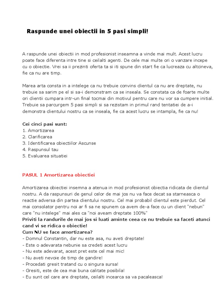 untuk "Care Este Ordinea Pasilor De Rezolvare A Unei Obiectii:"