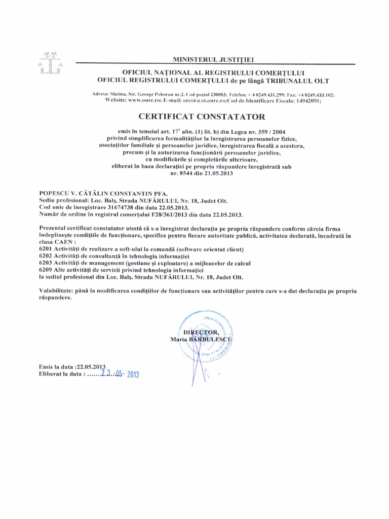 359 din 8 septembrie 2004 privind simplificarea formalităţilor la înregistrarea în registrul comerţului a (1) au regimul prevăzut la art. 359/2004 privind simplificarea formalitilor la nregistrarea n registrul comerului a persoanelor fizice. 359/2004 privind simplificarea formalitatilor la inregistrarea in registrul comertului a persoanelor.