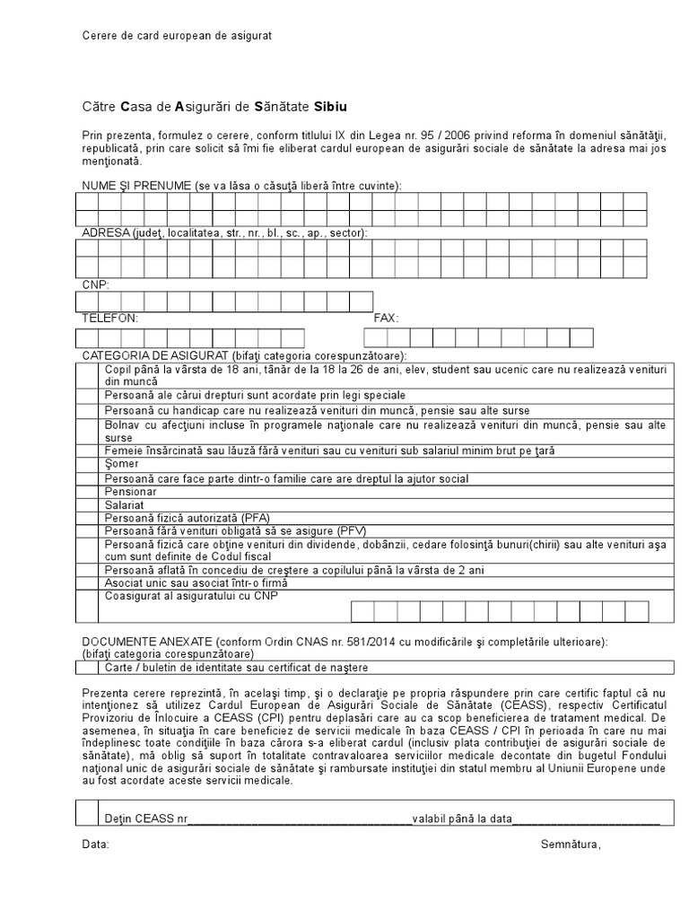 95/2005 privind reforma în domeniul sănătăţii, prin care solicit să îmi fie eliberat cardul european de asigurări sociale de sănătate la adresa mai jos menţionată. Workshop online de prezentare a subiectelor ştiinţifice pe înţelesul publicului larg 05.04.2021. Cerere card european de sanatate.