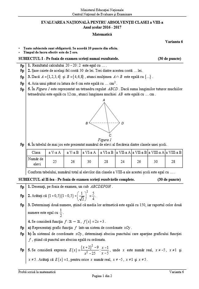 Subiecte matematica evaluare nationala 2017 prima proba la evaluarea nationala: