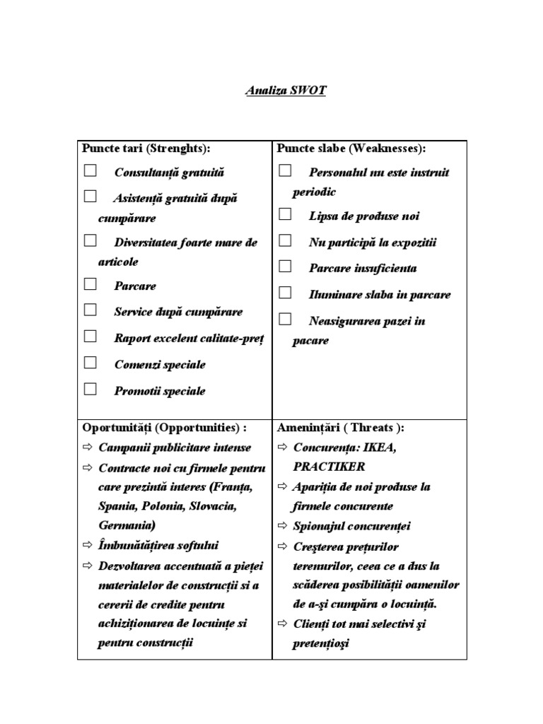 Many companies are conducting a strengths, weaknesses, opportunities, and threats (swot) analysis as part of the. Analiza swot este o metoda des folosita in mediul de afaceri, pentru ca ajuta la proiectarea unei viziuni de ansamblu asupra firmei. Ofera un tablou cuprinzator ce arata valorile interne si punctele critice.
